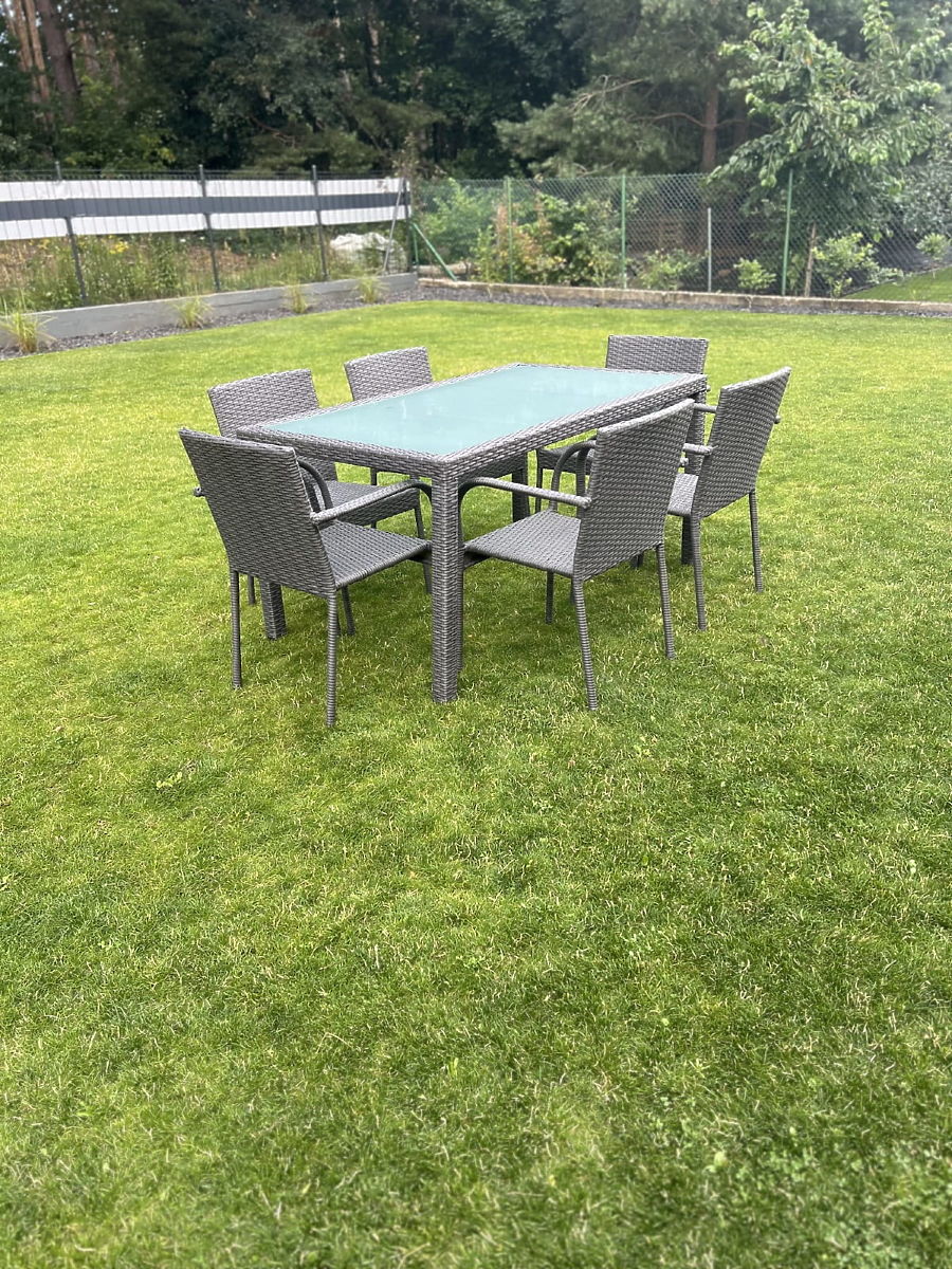 Das Essmöbel-Set AVVICENTE wurde für Liebhaber stilvoller, aber gleichzeitig praktischer Lösungen entworfen und ist die perfekte Ergänzung für jeden Außenbereich. Die leichte Konstruktion des Tisches ermöglicht ein einfaches Umstellen, was außergewöhnliche Vielseitigkeit bietet und die Anpassung der Anordnung an individuelle Bedürfnisse ermöglicht. Gartenmöbel aus Technorattan bestechen nicht nur durch ihre Eleganz, sondern garantieren auch Beständigkeit gegen Regen, starke Sonneneinstrahlung und Frost, wodurch der Bedarf an intensiver Pflege entfällt. Zudem bieten die bequemen Stühle maximalen Komfort, was jeden Moment im Freien noch angenehmer macht. Das Gartenmöbel-Set AVVICENTE ist ein Synonym für Langlebigkeit und Eleganz und erfüllt perfekt die Bedürfnisse moderner Nutzer, die nach Möbeln suchen, die jahrelang halten. Farbe des AVVICENTE-Sets: grau, gebürstete Struktur Geflecht: Technorattan 7-8mm x 1,2mm Möbelkonstruktion: Tisch - Aluminium, Stühle - Stahl Das Set besteht aus 7 Elementen: 1 x Tisch (mit einer matten Glasplatte aus 5mm Sicherheitsglas): Länge: 150 cm Breite: 90 cm Höhe: 74 cm 6 x Stühle: Breite: 56 cm Tiefe: 50 cm Höhe: 84 cm Sitzhöhe vom Boden: 44 cm Rückenlehnenhöhe vom Sitz: 43 cm Sitzbreite: 40 cm Sitztiefe: 43 cm Das Set wird auf 1 Palette mit den Maßen 120x80x170 cm, Gewicht 60 kg, versendet. Möglichkeit, Kissen für die Stühle hier zu kaufen. Die Stühle können nach dem Auspacken sofort verwendet werden. Die Stühle sind stapelbar (können ineinander gestellt werden), was die Lagerung erleichtert und die Möbel nehmen nicht viel Platz ein. Der Tisch ist zur einfachen, eigenständigen Montage gemäß der beiliegenden Anleitung vorgesehen. Die matte Glasplatte des Tisches ist in den Technorattan-Rahmen eingebaut. Technorattan ist beständig gegen schädliche Witterungseinflüsse, jedoch empfehlen wir, für eine noch längere Erhaltung des unveränderten Aussehens der Möbel eine Schutzhülle zu kaufen. Die Hülle in dunkelgrauer Farbe ist einteilig und hat unten eine Kordel. Alle Hüllen werden maßgeschneidert und die Lieferzeit beträgt ca. 14 Werktage. Stellen Sie sich Gartenmöbel vor, die Ihre Erwartungen in jeder Hinsicht übertreffen – von der Beständigkeit bis zum Design. Das ist BELLO GIARDINO, wo jedes Detail zählt und Luxus auf Funktionalität trifft: Unveränderte Qualität: Unser synthetisches Rattan garantiert, dass die Möbel jahrelang halten, ohne an Schönheit oder Haltbarkeit zu verlieren. Wetterbeständigkeit: Unsere Möbel trotzen den härtesten Wetterbedingungen, von brennender Sonne bis zu eisigen Wintern, und bleiben dennoch schön. Luxuriöser Komfort: Dicke, weiche Kissen laden zur Entspannung ein und bieten Komfort, der schwer anderswo zu finden ist. Leichtigkeit und Stabilität: Die Aluminiumkonstruktion vereint das Beste aus beiden Welten – sie ist leicht, aber äußerst stabil. Design, das verzaubert: Jedes Element unserer Möbel wurde mit Blick auf Ästhetik und Funktionalität entworfen, um in jede Umgebung zu passen. Ob Sie Minimalismus lieben oder reiche, elegante Arrangements schätzen, unsere Möbel erfüllen Ihre Erwartungen und überschreiten die Grenzen gewöhnlicher Funktionalität und Ästhetik. Wir garantieren, dass selbst die anspruchsvollsten Kunden dem Komfort und Stil, den BELLO GIARDINO bietet, nicht widerstehen können. Machen Sie Ihren Garten, Ihre Terrasse oder Ihren Balkon zu einer Oase der Entspannung und Eleganz, die Sie schon immer haben wollten. Warten Sie nicht, entdecken Sie BELLO GIARDINO noch heute und verwandeln Sie Ihre Außenbereiche in Orte, von denen Sie immer geträumt haben. Fotos von Möbeln unserer Kunden: