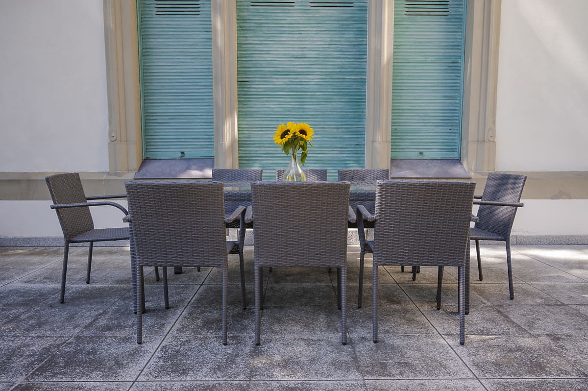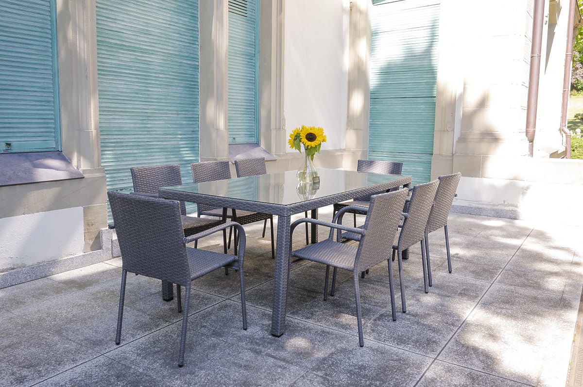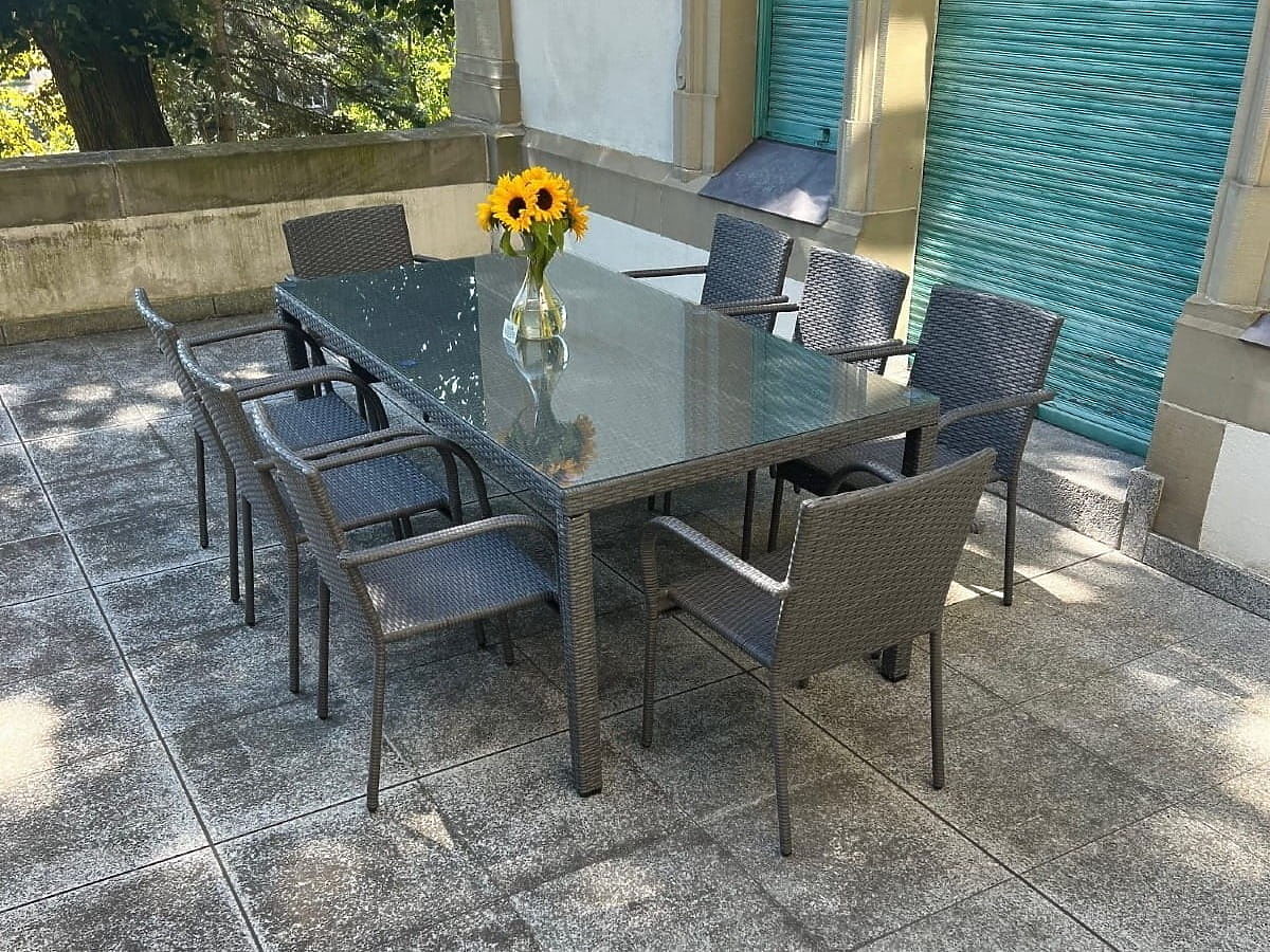 Das Ess-Set SOTTILE wurde für Liebhaber eleganter Zusammenkünfte im Kreise der Liebsten entworfen und stellt eine ideale Verbindung von Stil und Komfort dar. Seine äußerst eleganten Möbel sind nicht nur eine großartige Dekoration für jeden Garten oder jede Terrasse, sondern bieten auch außergewöhnliche Bedingungen für die Zeit im Freien. Gartenmöbel aus Technorattan wurden mit hervorragender Präzision gefertigt, was ihren luxuriösen Charakter unterstreicht, und die Verwendung von hochwertigem Technorattan garantiert nicht nur Beständigkeit gegen Regen und schädliche UV-Strahlung, sondern auch Langlebigkeit und einfache Pflege. Das Terrassen-Set SOTTILE mit praktischem Material und durchdachtem Design ist nicht nur eine praktische, sondern auch eine ästhetische Lösung, die jeden verzaubert, der die Verbindung von Modernität mit traditioneller Eleganz in der Gestaltung von Außenbereichen schätzt. Farbe des SOTTILE-Sets: grau, gebürstete Struktur Geflecht: Technorattan 7-8mm x 1,2mm Möbelkonstruktion: Tisch – Aluminium, Stühle – Stahl Das Set besteht aus 9 Elementen: 1 x Tisch: Länge: 200 cm Breite: 100 cm Höhe: 74 cm Glasplatte aus 5 mm Sicherheitsglas, auf Technorattan-Geflecht gelegt 8 x Stühle: Breite: 56 cm Tiefe: 50 cm Höhe: 84 cm Sitzhöhe vom Boden: 44 cm Rückenlehnenhöhe vom Sitz: 43 cm Sitzbreite: 40 cm Sitztiefe: 43 cm Das Set wird auf 1 Palette mit den Maßen 120x80x210 cm, Gewicht 80 kg, versendet. Die Stühle können nach dem Auspacken sofort verwendet werden. Die Stühle sind stapelbar (Möglichkeit, einen in den anderen zu stellen), was die Lagerung erleichtert und die Möbel wenig Platz beanspruchen. Der Tisch ist zur einfachen, selbstständigen Montage gemäß der beigefügten Anleitung vorgesehen. Die Glasplatte des Tisches ist auf Silikonsaugnäpfen befestigt, die sie vor dem Verrutschen schützen. Möglichkeit, Kissen für die Stühle hier zu kaufen. Technorattan ist beständig gegen schädliche Witterungseinflüsse, jedoch empfehlen wir für eine längere Erhaltung des unveränderten Aussehens der Möbel den Kauf einer Schutzabdeckung. Die Abdeckung in dunkelgrauer Farbe ist einteilig und hat unten eine Kordelzug. Alle Abdeckungen werden maßgeschneidert und die Lieferzeit beträgt ca. 14 Werktage. Stellen Sie sich Gartenmöbel vor, die Ihre Erwartungen in jeder Hinsicht übertreffen – von der Beständigkeit bis zum Design. Das ist BELLO GIARDINO, wo jedes Detail zählt und Luxus auf Funktionalität trifft: Unvergängliche Qualität: Unser synthetisches Rattan garantiert, dass die Möbel jahrelang halten, ohne an Schönheit oder Haltbarkeit zu verlieren. Wetterbeständigkeit: Unsere Möbel trotzen den härtesten Wetterbedingungen, vom sengenden Sonnenschein bis zu eisigen Wintern, und bleiben dabei stets schön. Luxuriöser Komfort: Dicke, weiche Kissen laden zur Entspannung ein und bieten Komfort, den man anderswo schwer findet. Leichtigkeit und Stärke: Die Aluminiumkonstruktion verbindet das Beste aus beiden Welten – sie ist leicht, aber äußerst stabil. Design, das verzaubert: Jedes Element unserer Möbel wurde mit Blick auf Ästhetik und Funktionalität entworfen, um in jede Umgebung zu passen. Ob Sie Minimalismus lieben oder reiche, elegante Arrangements schätzen, unsere Möbel erfüllen Ihre Erwartungen und überschreiten die Grenzen gewöhnlicher Funktionalität und Ästhetik. Wir versichern, dass auch die anspruchsvollsten Kunden dem Komfort und Stil, den BELLO GIARDINO bietet, nicht widerstehen können. Machen Sie Ihren Garten, Ihre Terrasse oder Ihren Balkon zu einer Oase der Entspannung und Eleganz, die Sie sich immer gewünscht haben. Warten Sie nicht, entdecken Sie BELLO GIARDINO noch heute und verwandeln Sie Ihre Außenbereiche in Orte, von denen Sie immer geträumt haben. Fotos von Möbeln unserer Kunden: