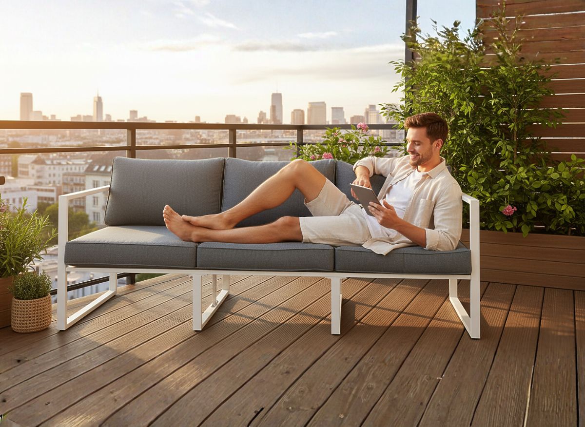 Das Gartensofa MOSTRARE vereint die Einfachheit des Minimalismus mit perfekter Verarbeitung und ist die ideale Ergänzung für moderne Außenbereiche. Das Entspannungssofa verleiht jedem Garten, jeder Terrasse oder jedem Balkon Stil und Klasse, dank seiner robusten Konstruktion aus pulverbeschichtetem Aluminium und dicken, bequemen Kissen, die maximalen Komfort bieten. Das Balkonsofa MOSTRARE ist nicht nur eine praktische, sondern auch eine ästhetische Wahl, die über Jahre hinweg ihre Schönheit und Funktionalität behält, unabhängig von den Wetterbedingungen. Farbe des Sofas MOSTRARE: Weiß Farbe der Kissen: Graumeliert Möbelkonstruktion: Aluminium (einfache Montage erforderlich) 1 x Sofa: Breite: 204 cm Tiefe: 67 cm Höhe: 63 cm Weitere Maße: Breite der Armlehnen: 4 cm Sitzhöhe des Sofas: 30 cm + 10 cm Kissen Sitzmaße des Sofas: 194 cm x 65 cm Rückenlehnenhöhe vom Sitz: 34 cm Sitzkissen mit Klettverschluss befestigt Das Sofa wird auf 1 Palette mit den Maßen 80x60x210 cm geliefert, Gewicht 30 kg Kissen in grauer Farbe im Set enthalten (3 Stück für die Sitze, 3 Stück für die Rückenlehnen). Alle haben abnehmbare Bezüge mit Reißverschluss, hergestellt aus Outdoor-Material (100% Polyester), die bei niedrigen Temperaturen gewaschen werden können. Die Kissenbezüge sind aus hochwertigem Stoff mit Teflonbeschichtung gefertigt, die sie vor Feuchtigkeit schützt. Die Kissenfüllung besteht aus hochwertigem Polsterschaum (mittlere Härte - T25), der Verformungen verhindert. Dicke der Sitzkissen: 10 cm. Möglichkeit, Kissen auf individuelle Bestellung für dieses Set zu nähen: https://www.bg-meble.pl/pl/p/Usluga-Krawiecka-Poduszki-Na-Zamowienie-/742 Möglichkeit, Kissenbezüge auf individuelle Bestellung für dieses Set zu nähen: https://www.bg-meble.pl/pl/p/Usluga-Krawiecka-Poszewki-Na-Zamowienie/743 Um das unveränderte Aussehen der Möbel noch länger zu genießen, empfehlen wir den Kauf einer Schutzhülle. Die Hülle in Dunkelgrau ist einteilig und hat unten einen Kordelzug. Alle Bezüge werden auf Bestellung genäht und die Lieferzeit beträgt ca. 14 Werktage. FOTOS VON UNSEREN KUNDEN: Stellen Sie sich Gartenmöbel vor, die Ihre Erwartungen in jeder Hinsicht übertreffen – von der Haltbarkeit bis zum Design. Hier ist BELLO GIARDINO, wo jedes Detail zählt und Luxus auf Funktionalität trifft: Unvergängliche Qualität: Unser synthetisches Rattan garantiert, dass die Möbel jahrelang halten, ohne an Schönheit oder Haltbarkeit zu verlieren. Wetterbeständigkeit: Unsere Möbel trotzen den härtesten Wetterbedingungen, von sengender Sonne bis zu eisigen Wintern, und bleiben dabei immer schön. Luxuriöser Komfort: Dicke, weiche Kissen laden zur Entspannung ein und bieten einen Komfort, den man anderswo kaum findet. Leichtigkeit und Stabilität: Die Aluminiumkonstruktion vereint das Beste aus beiden Welten – sie ist leicht, aber äußerst stabil. Design, das verzaubert: Jedes Element unserer Möbel wurde mit Blick auf Ästhetik und Funktionalität entworfen, um in jede Umgebung zu passen. Ob Sie Minimalismus lieben oder reiche, elegante Arrangements schätzen, unsere Möbel erfüllen Ihre Erwartungen und überschreiten die Grenzen gewöhnlicher Funktionalität und Ästhetik. Wir versichern, dass selbst die anspruchsvollsten Kunden dem Komfort und Stil von BELLO GIARDINO nicht widerstehen können. Machen Sie Ihren Garten, Ihre Terrasse oder Ihren Balkon zu einer Oase der Entspannung und Eleganz, die Sie sich schon immer gewünscht haben. Warten Sie nicht, entdecken Sie BELLO GIARDINO noch heute und verwandeln Sie Ihre Außenbereiche in Orte, von denen Sie immer geträumt haben.
