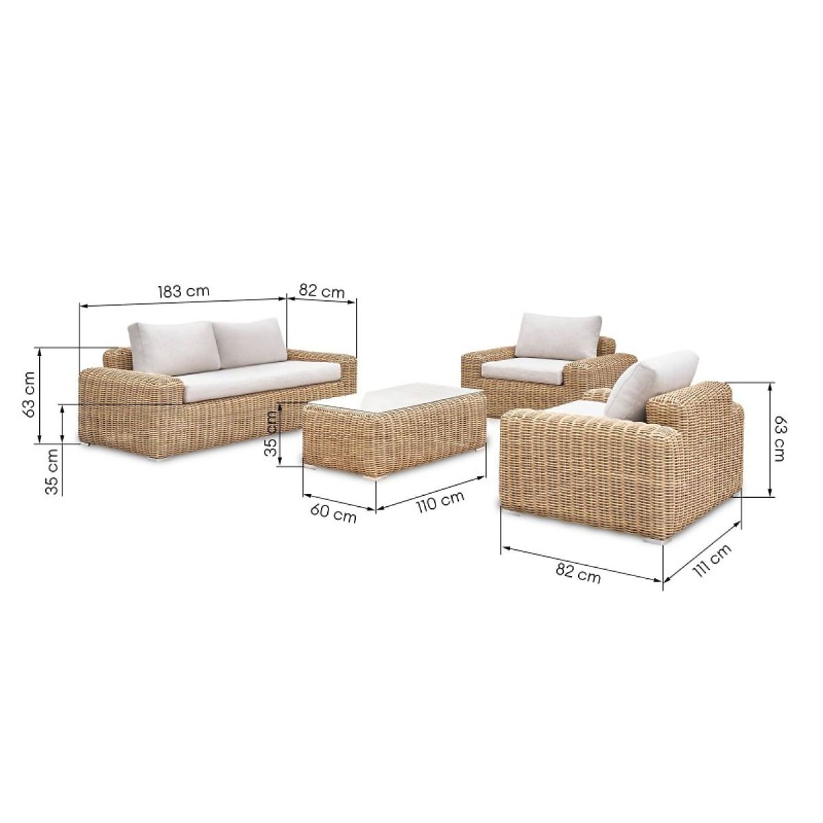 Das Gartenmöbel-Set Sandy ist eine stilvolle Kombination aus einem geräumigen Sofa, zwei Sesseln und einem Couchtisch, die Komfort und Eleganz in jedem Außenbereich bietet. Hergestellt aus hochwertigem synthetischem Rattan, vereint es modernes Design mit Funktionalität und bietet dank der weichen Kissen einen komfortablen Rückzugsort.