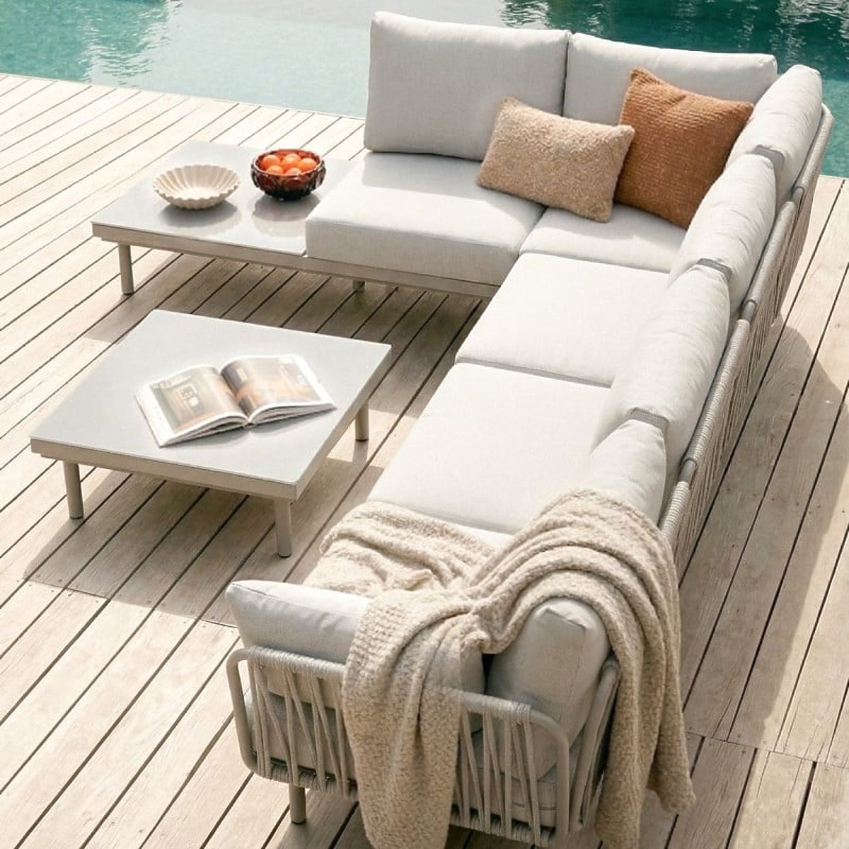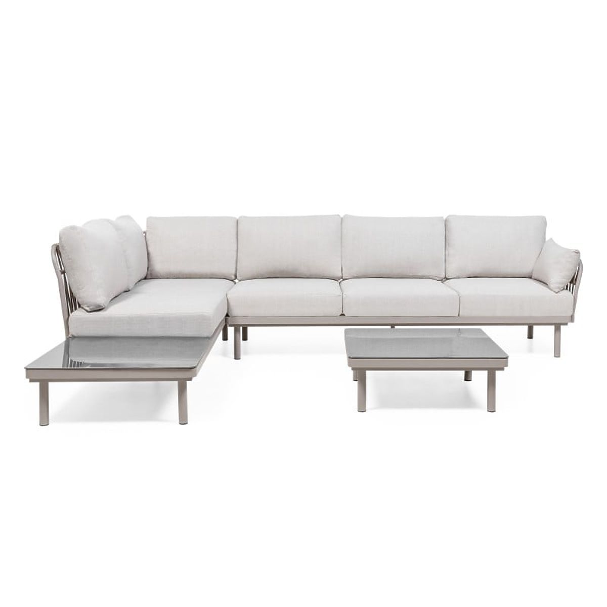 Ecksofa Amarello – sanfte Eleganz in harmonischer Form. Die Aluminiumkonstruktion in beigegrauem Ton, das strapazierfähige Geflecht und die bequemen Kissen schaffen einen anspruchsvollen Raum zur Entspannung, ergänzt durch einen praktischen Tisch und ein seitliches Regal.
