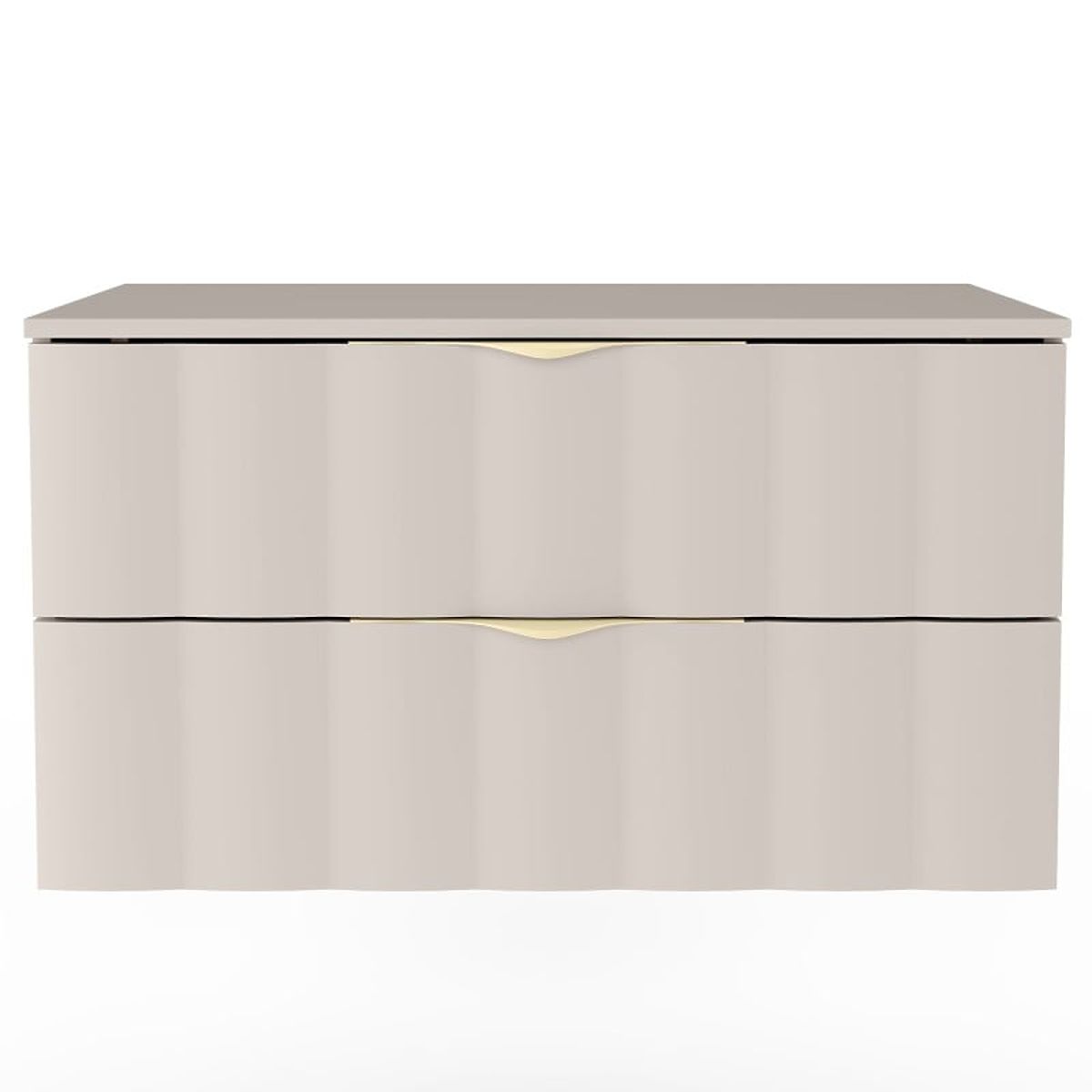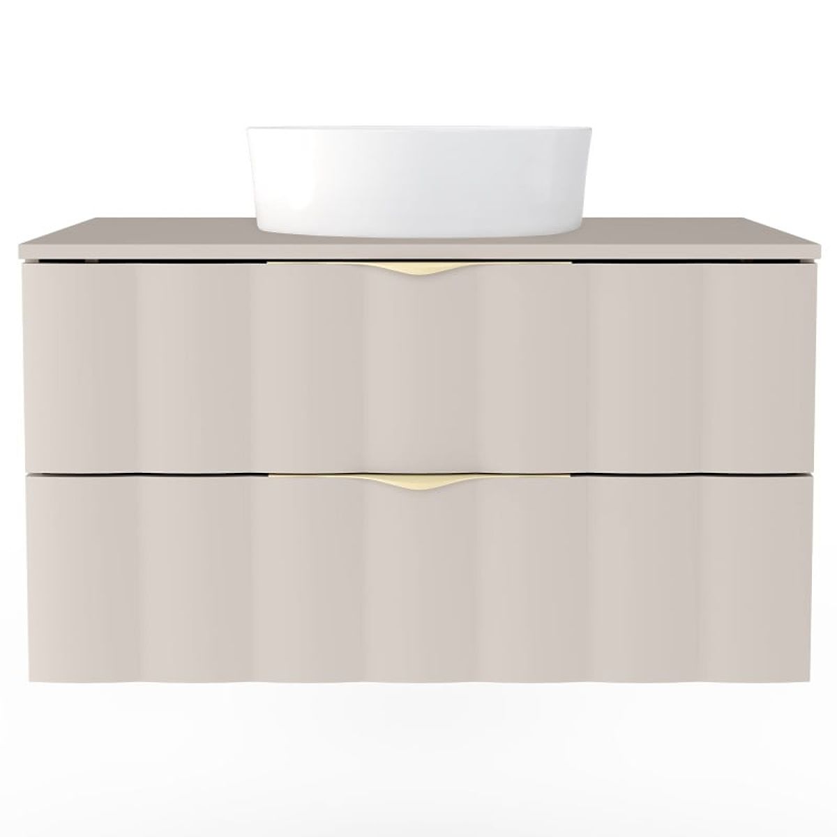 Kaschmirbeiger Waschtischunterschrank mit gewelltem Frontpanel und goldenen Griffen. .. mehr