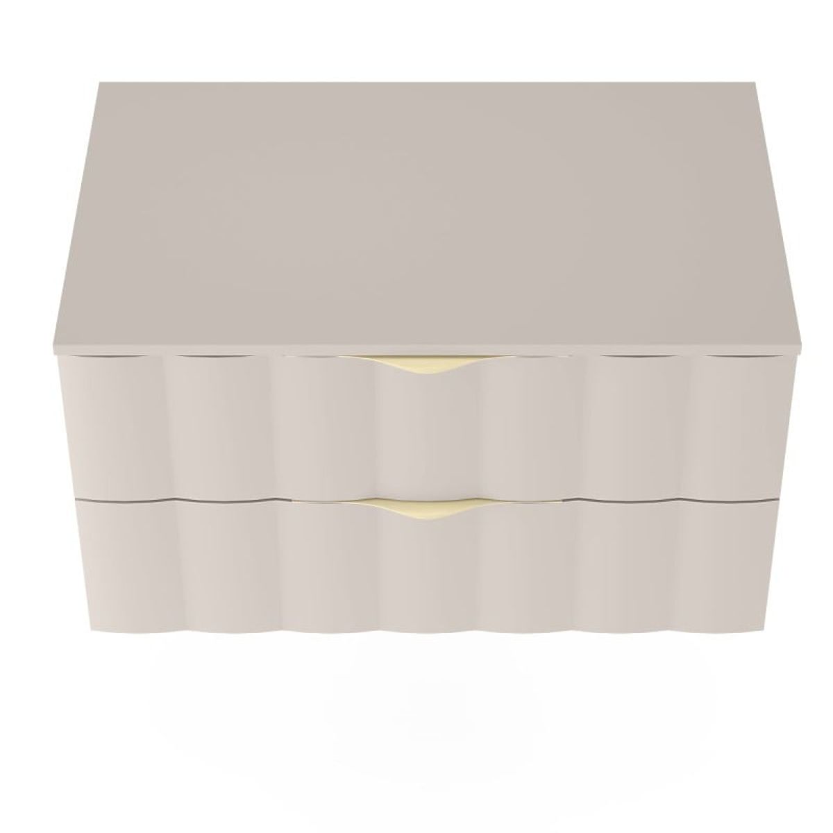 Heben Sie den Standard Ihres Badezimmers mit dem kaschmirbeigen Omi-Schrank mit elegantem Design und gewelltem Frontpanel an. Zwei geräumige Schubladen mit Soft-Close-Funktion und Griffen in gebürstetem Gold sorgen für perfekte Organisation.