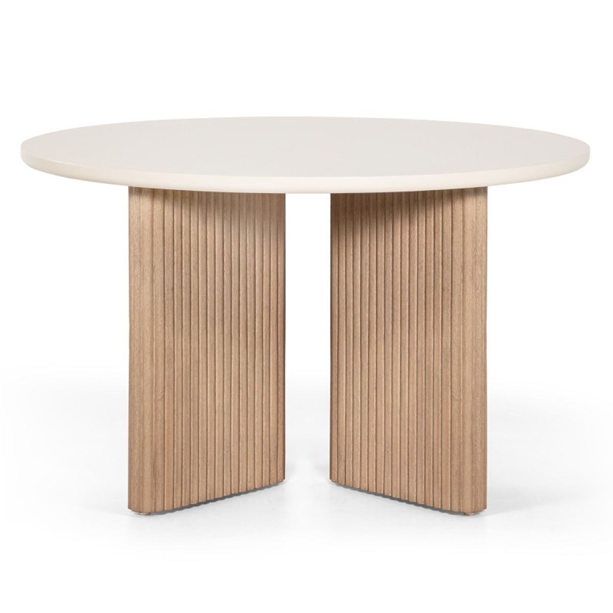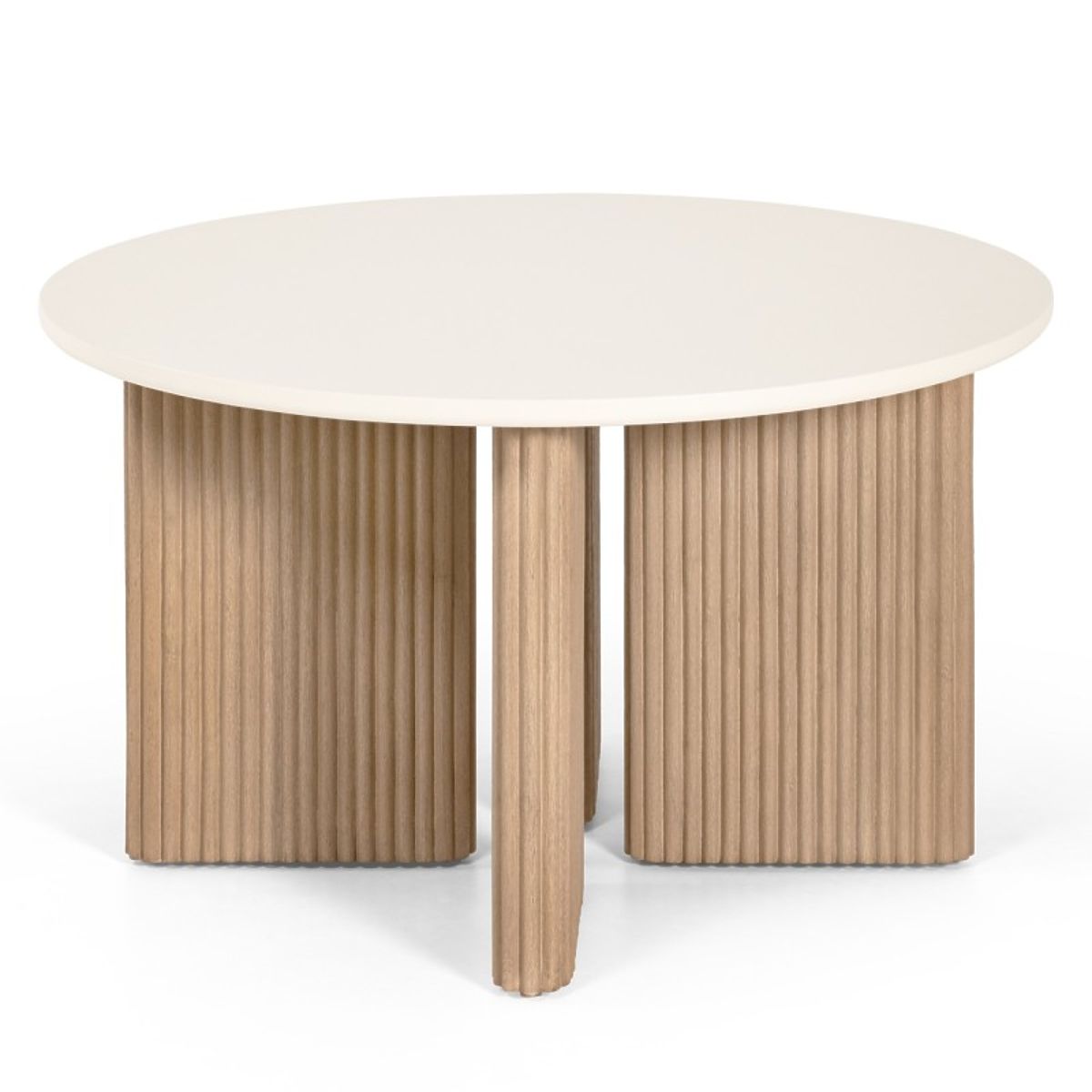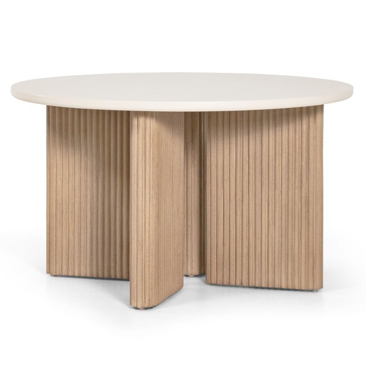 Lukahome.at » Gartenmöbel / Gartentische / Gartentisch Komorebi 130 cm mit Steinplatte, helles Akazienholz/hellbeige, rund, Lamellen