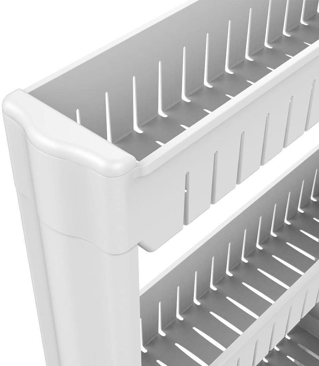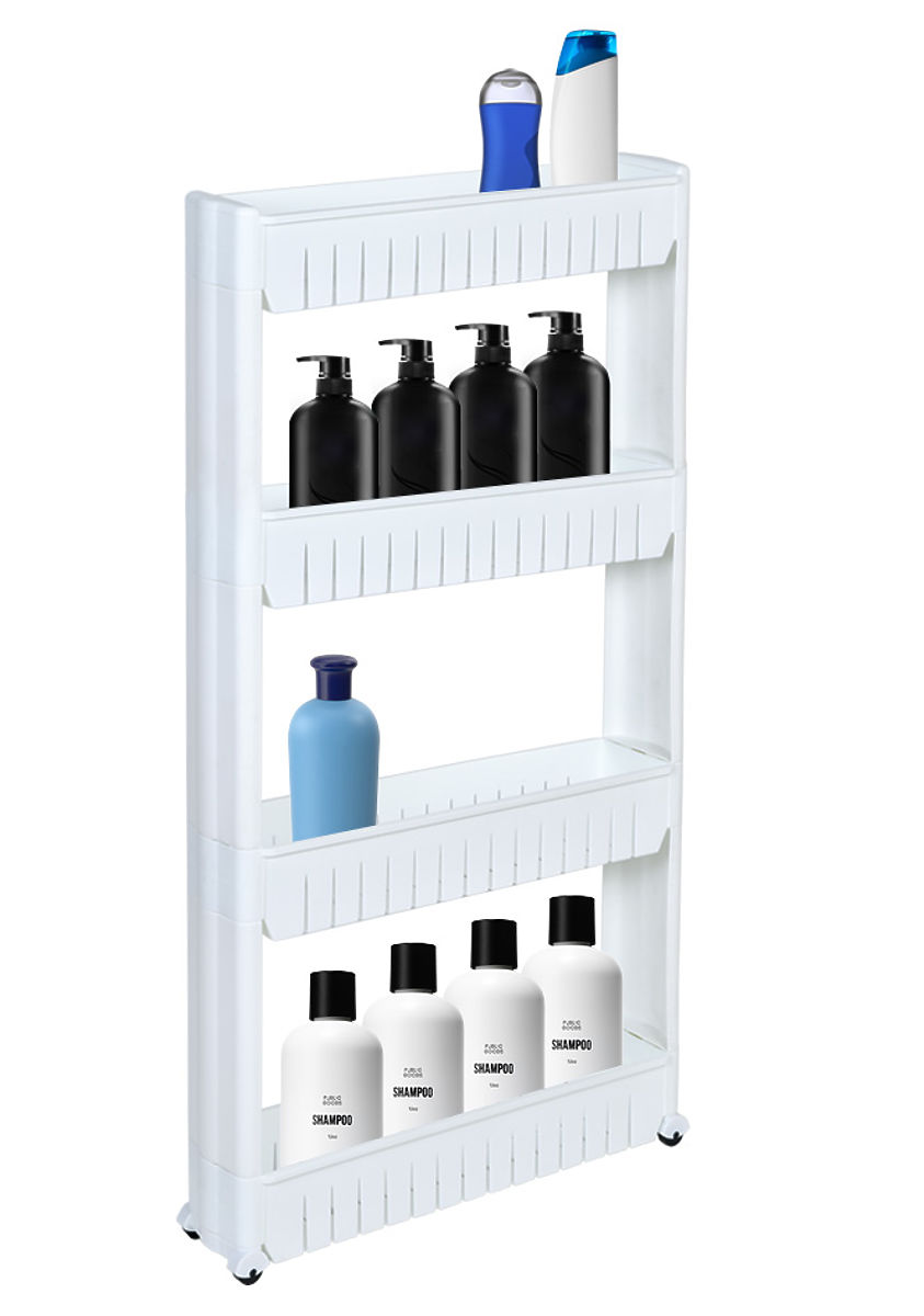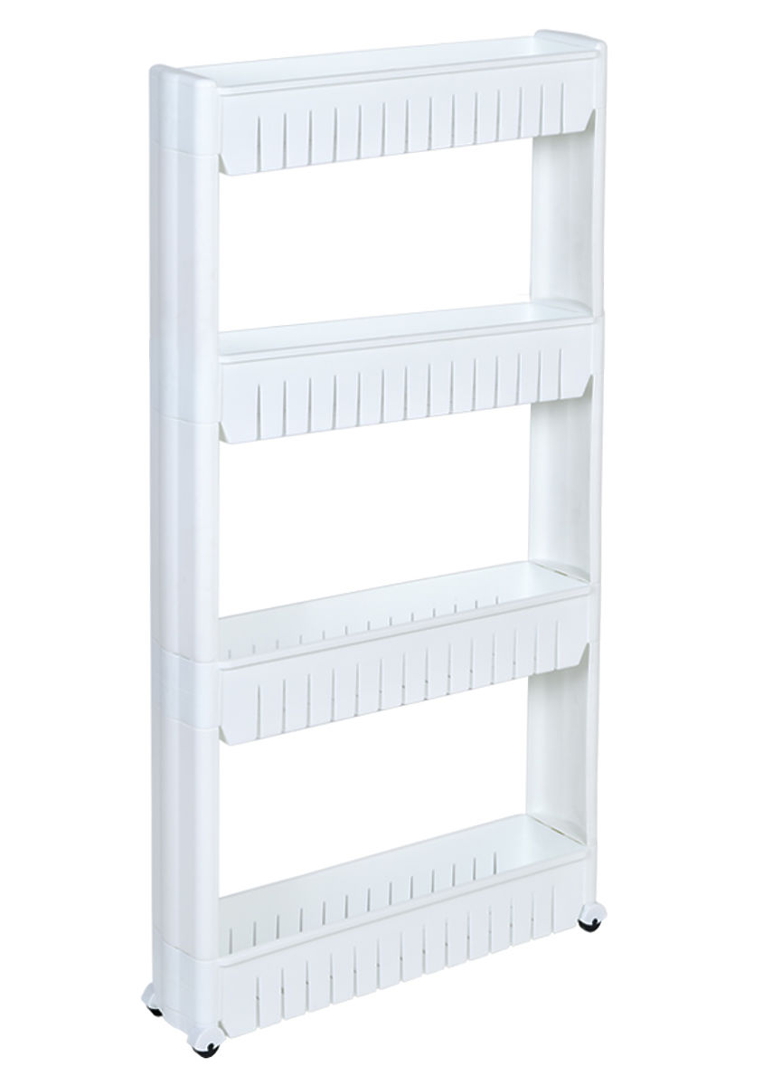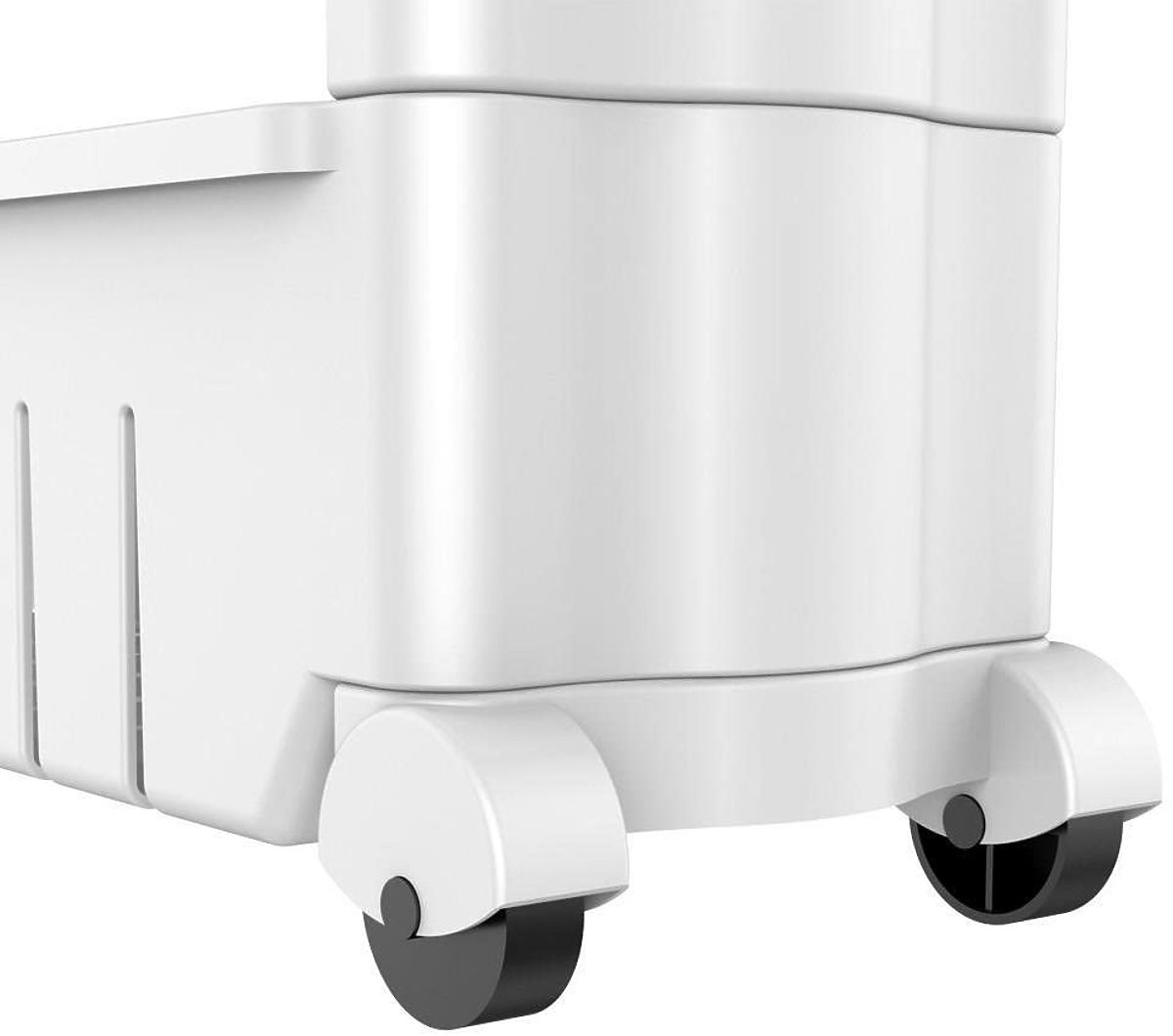 Mobiler Schrank, ideal für enge Räume wie Küche oder Badezimmer. Seine modulare Konstruktion aus robustem Kunststoff ermöglicht eine einfache Anpassung an die Bedürfnisse – Regale können hinzugefügt oder entfernt werden. Dank der kompakten Abmessungen passt er perfekt zwischen Schrank und Kühlschrank, Waschmaschine oder in andere schwer zugängliche Bereiche. Das Küchenregal ist ideal zur Aufbewahrung von Gewürzen, Küchenutensilien, Kosmetika, Reinigungsmitteln und vielen weiteren notwendigen Dingen. Die Mobilität wird durch vier Rollen gewährleistet, die es ermöglichen, den Badezimmerschrank auf Rollen leicht dorthin zu bewegen, wo er benötigt wird.