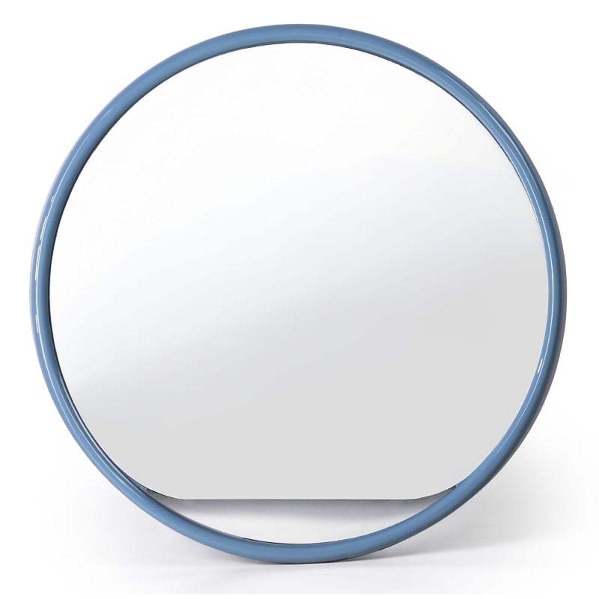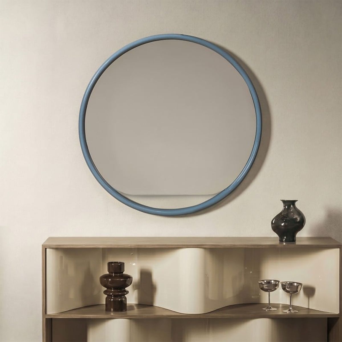 Zelia ist ein rundes Spiegel mit einem blauen, glänzenden Rahmen. Sein klassisches Design und die sanfte Farbe bringen Stil und Eleganz in den Innenraum.