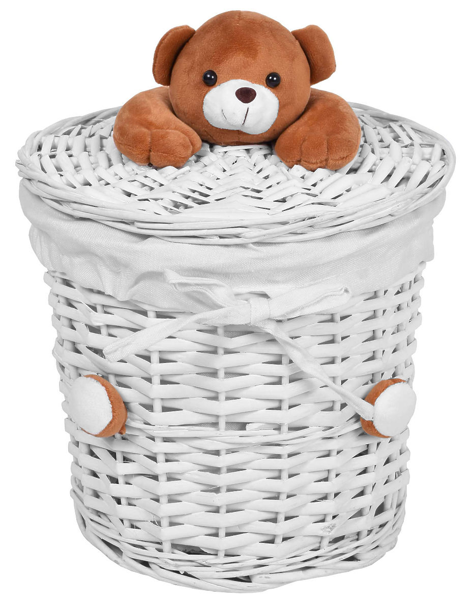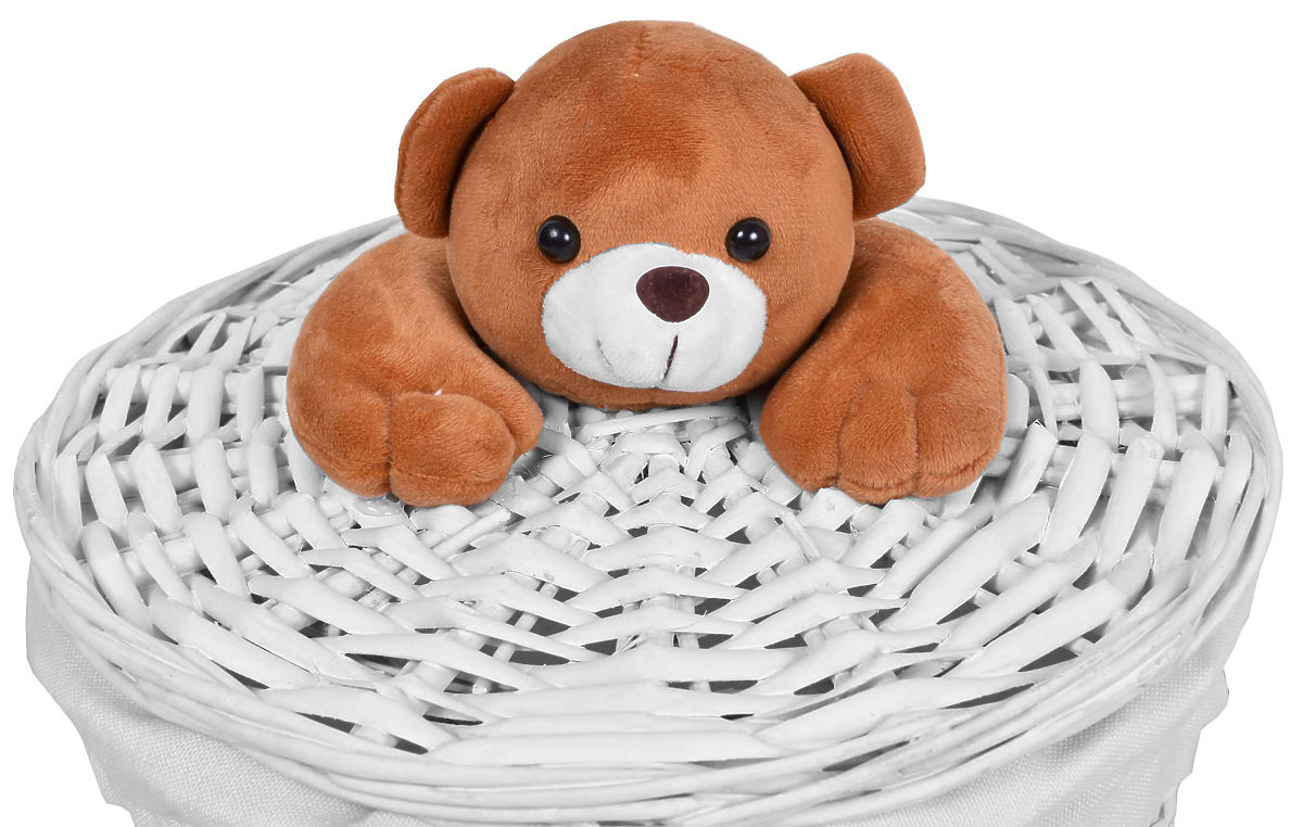 Das Produkt ist aus gleichmäßig geflochtenem Weidenmaterial gefertigt und innen mit einem strapazierfähigen, cremefarbenen Leinenmaterial ausgekleidet. Der Deckel ist mit einem angenehm weichen Plüschbären versehen.